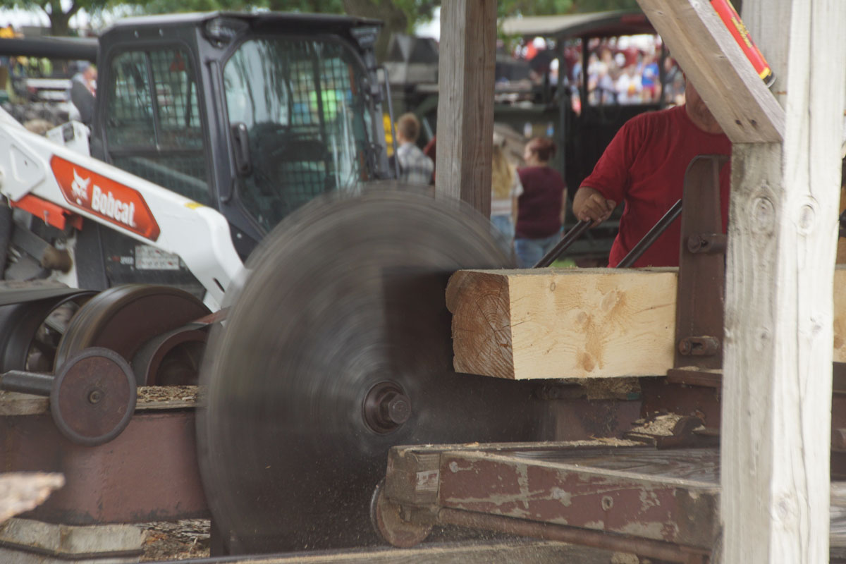 How does the tree that was cut down become the lumber that was used to build the Flour Mill’s building? Visit the Saw Mill south of the Feature Building to see. The Saw Mill can be run by any tractor with a belt pulley, but is usually seen powered by a steam engine. From removing the bark off the tree to cutting the tree into the rough plank construction lumber that can be purchased at a home improvement store, this saw mill does it all.